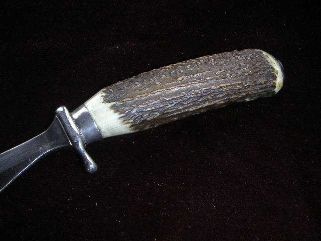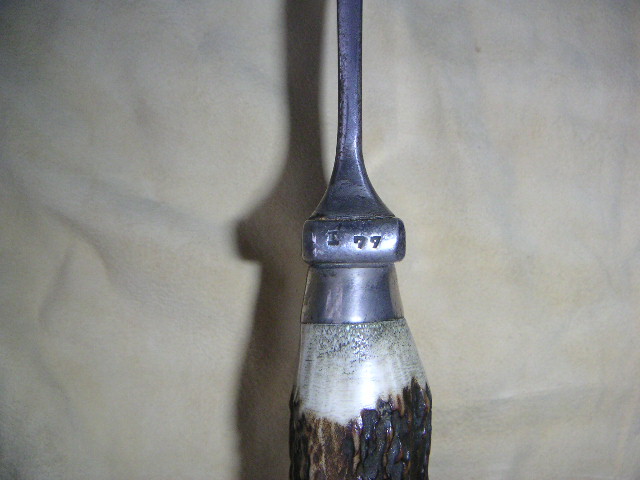 Hier die angekündigten Fotos von der DeLuxe Ausführung. Außer der erstmaligen Erwähnung im Visier-Bericht gab es offenbar bisher nirgends eine Veröffentlichung über dieses Repräsentationsstück. Carl Scholz soll es auch nur als Einzelstück aufgelegt haben, um es als außergewöhnliches Geschenk einem adligen Jagdherrn als Dank zukommen zu lassen. Die Klinge ist signiert von Carl Scholz, darunter befindet sich die Ätzung „ Hubertusjagd 1950 - Waidmannsheil! “.