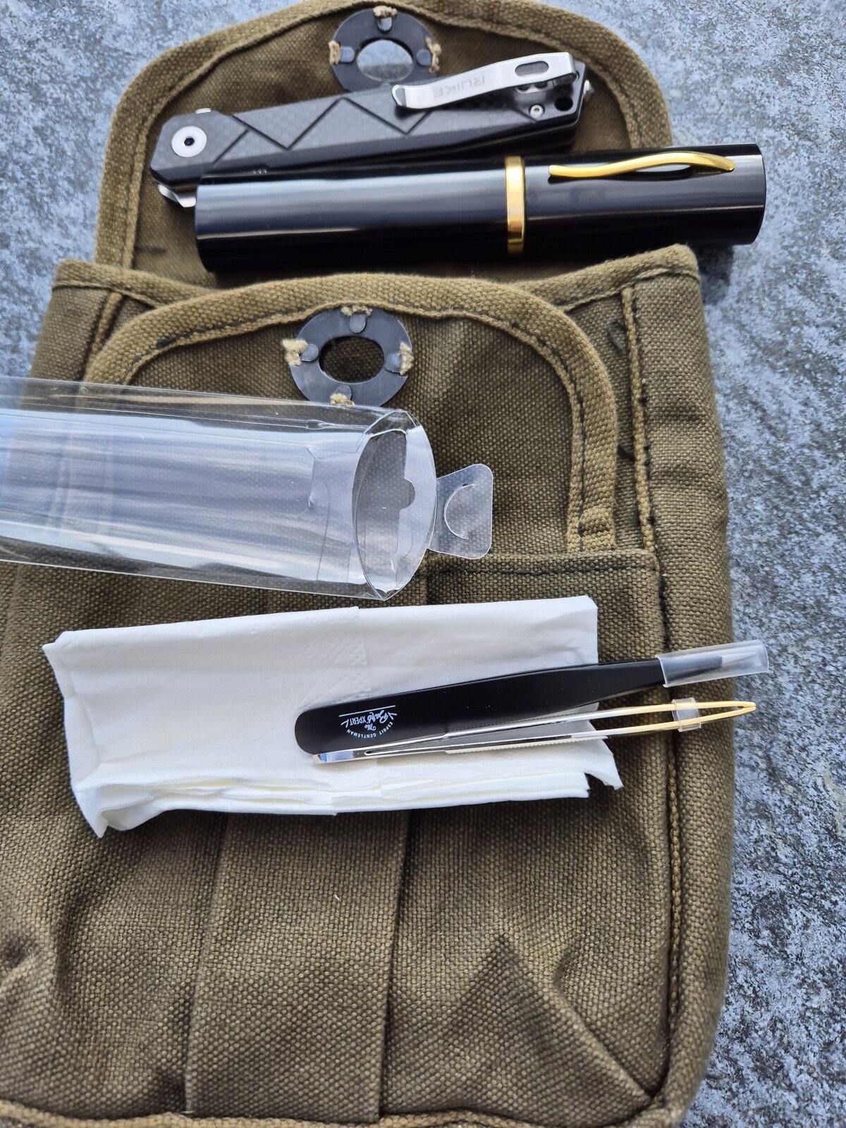 Was mich besonders gefreut hat, für das Ruike P127-CB in 14C28N konnte ich mich nie richtig erwärmen. Aber zum Verstauen in dieser Tasche geradezu ideal. Außerdem finden auch noch zwei Pincetten Platz, für den Fall, dass ich Zecken entfernen muss. Damit diese Pinzetten nicht klappern, habe ich sie in ein Papiertaschentuch eingewickelt.