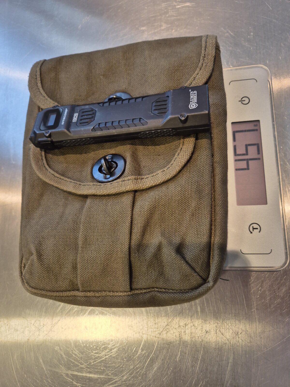 Zur Zeit überlege ich mir gerade, ob ich diese Tasche noch mit einer Taschenlampe ausrüsten soll. Es wird ja jetzt wieder sehr schnell dunkel. Ich habe eine tolle Taschenlampe von @bmesser erhalten. Die Nitecore EDC29 hat den entscheidenden Vorteil, dass sie einen Sicherheitsschalter hat, und somit ist unbeaufsichtigtes Einschalten der Lampe ausgeschlossen. Mit der Nitecore EDC29 wäre dann das Gesamtgewicht: