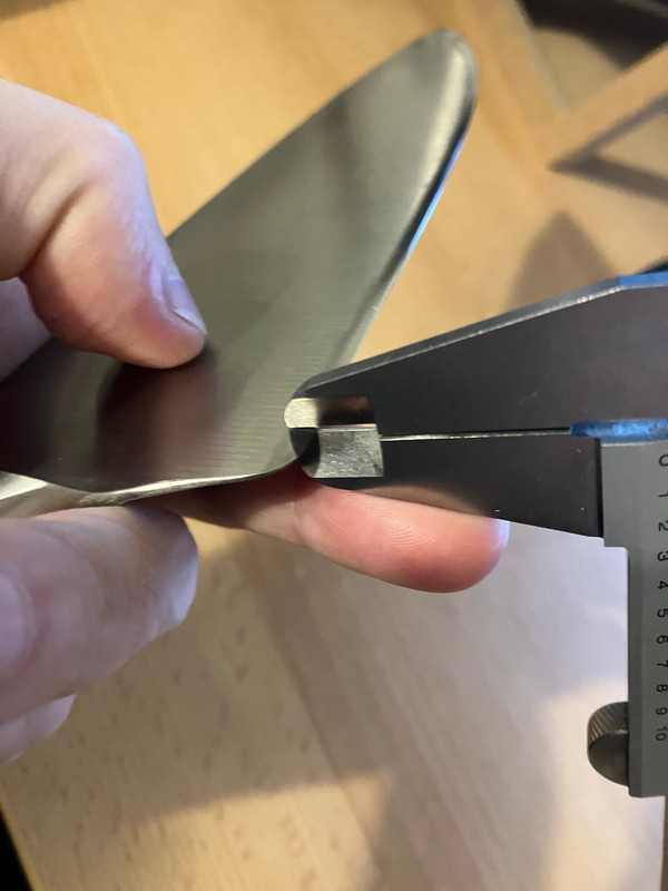 Hier im Bild habe ich mal einen Messschieber auf 0.55 mm gestellt und die Klinge hineingeschoben. So reicht der Messschieber bis zum Rand des polierten leicht balligen Bereichs.