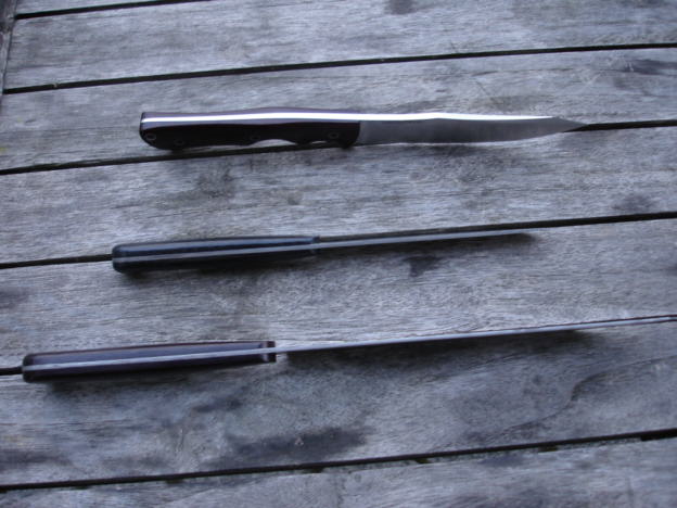 Ich hänge hier mal ein paar Fotos von Jürgens Küchenmesser dran. Zur Veranschaulichung auch noch mal mit dem Forumsmesser. Da kann man gut erkennen, dass die Küchenmesser dünner sind. Das macht auch Sinn. Außerdem sind sie nicht so "verbaut", haben also keine Ecken und Hohlnieten, Zwecks besserer Reinigung.