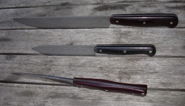 Die Kochmesser sind aus DAMASTEEL (rostfrei), der Griff aus Micata (wasserfester als Holz)