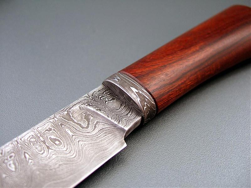 Klinge aus demselben Damast, 112mm lang und 3,5mm stark; leicht ballig