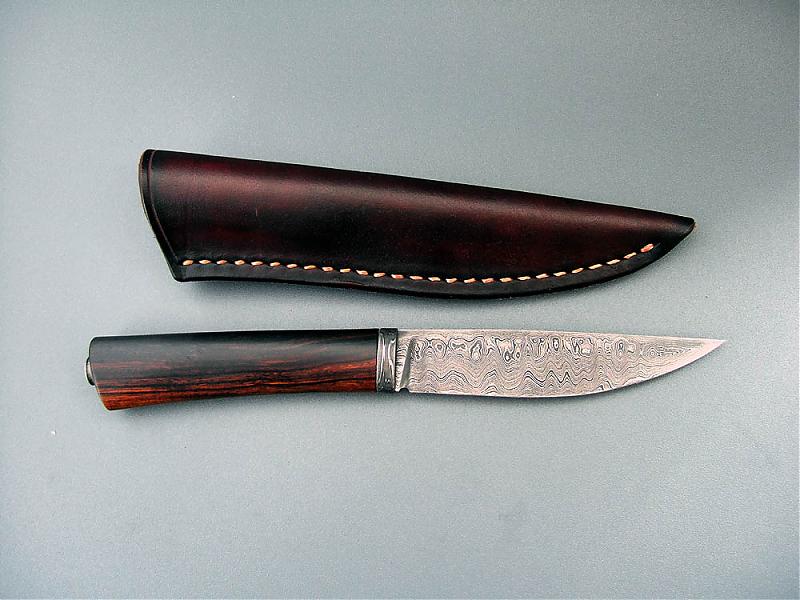 Montiert in Damast und Wüsteneisenholz, Erl durchgehend und verschraubt, Grifflänge 108mm